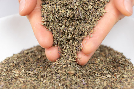 Seasoning dried basil in human hands, handful of chopped basil close-up.