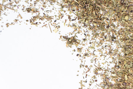 Dry basil spice seasoning macro texture on white background