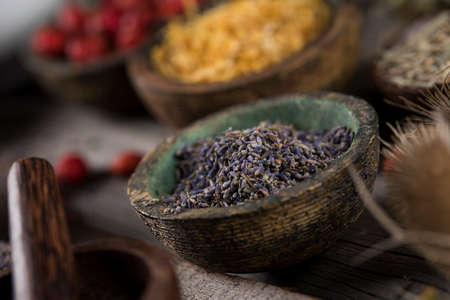 Dried lavender flowers in a gray bowl on the light background, selective focus