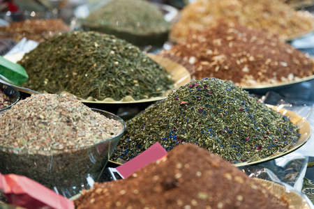 A mixture of different spices close up. Textures of colorful spices and condiments.Colorful Herbal and Spices Oriental.Cafe concept.Various Indian spices