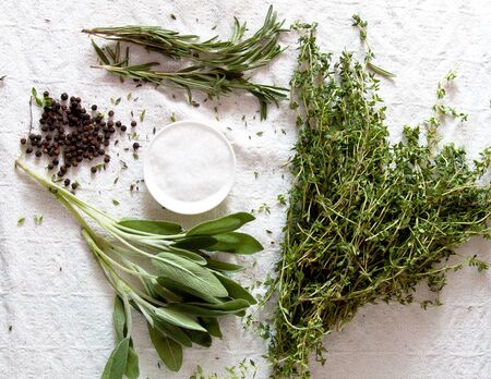 Sage, rosemary, thyme bunches ready for cooking, with rock sea salt and peppercorns