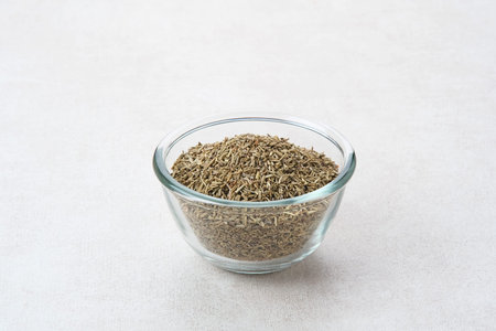 Dried Thyme leaves for making herbal medicinal tea on a light green background.
