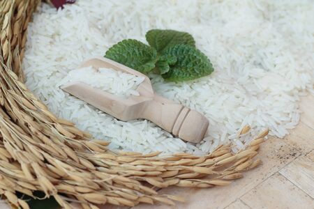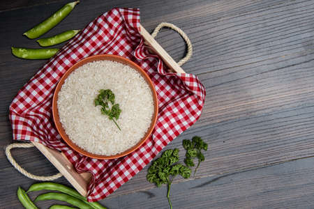 Rice set on wooden plate with space on background