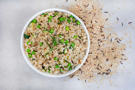 Wild and brown rice pilaf with green peas, onion and baby marrow on mottled grey with copy space