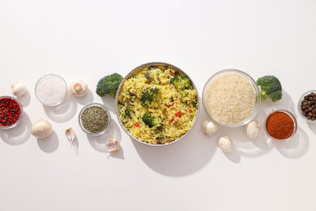 Pilaf in bowl and spices on white background, top view