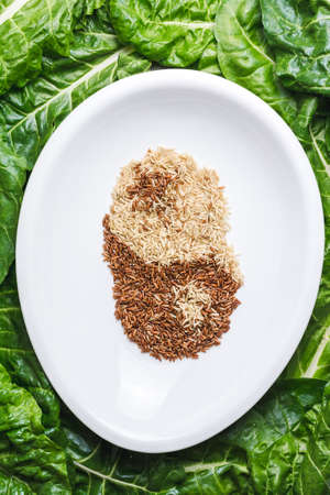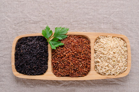 Organic raw brown rice and riceberry rice in close up
