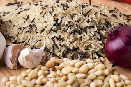 Raw ingredients: wild rice, garlic, red onion and pine nuts.