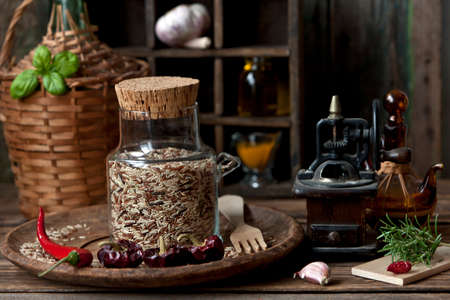 Close-up of mixed rice in glass bottle with garlic and red hot chili pepper on wooden background