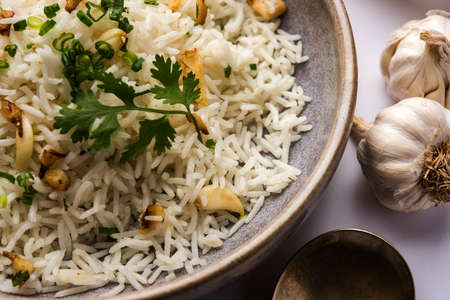 Garlic fried rice - cooked white basmati rice fried with garlic and served with yellow dal, popular indian recipe