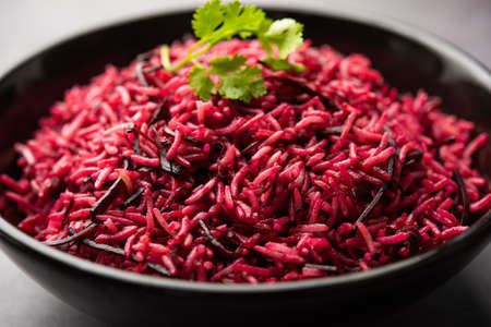 Beetroot Rice or pulao or pulav served in a bowl or karahi, selective focus. Indian food