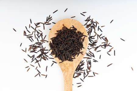 Raw wild rice in a wooden spoon on white background