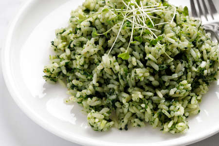 Spinach Rice with microgreens on white plate with fork on marble Background, Healthy Vegetarian diet Food. Green Rice with Spinach. close up