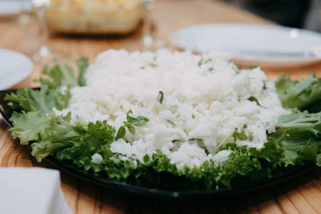 Cooking rice with herbs in a cooking class. Homemade food, crumbly rice with lettuce leaves on a plate.