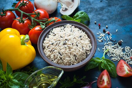 Ingredients for cooking - rice, vegetables and herbs. Top view with copyspace. Organic food background.