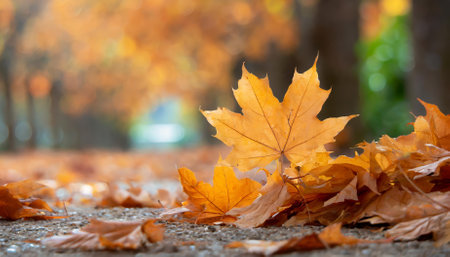 Autumn brilliance unfolds with vibrant orange maple leaves adorning the ground, set against a beautifully defocused bokeh background. This imagery celebrates the elegance of falls warm tones and