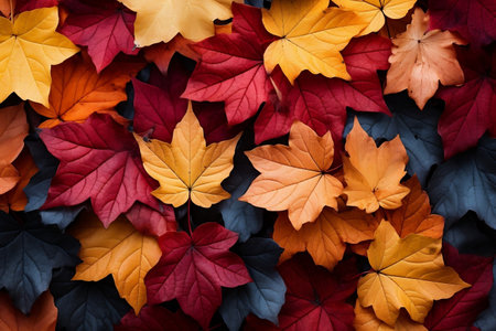 Fallen autumn leaves in various shades of red, orange, and yellow create a beautiful natural tapestry, showcasing the vibrant colors of the fall season