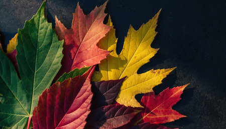 A mesmerizing row of colorful leaves displays fall's stunning gradient and artistic beauty. AI generated image