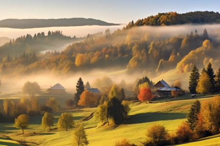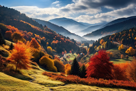 Enchanting autumn landscape. sunny panorama of rural idyllic countryside with vibrant fall colors