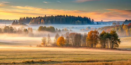 Autumn landscape. Morning fog in the meadow and forest.