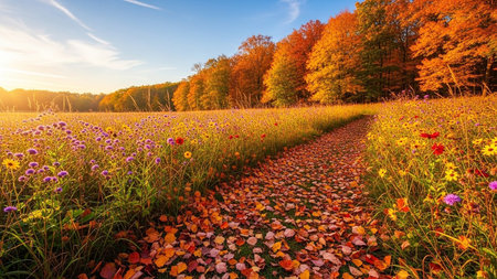 Colorful autumn landscape with road and meadow with colorful flowers.