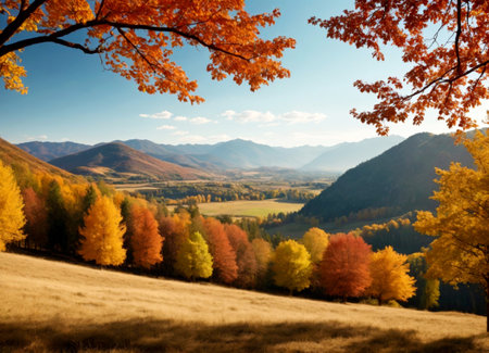 A serene autumn landscape with golden fields and colorful foliage