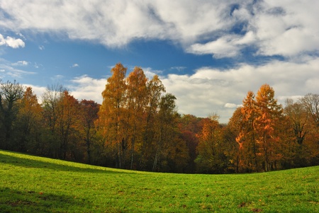 Autumn landscape with colorful trees and meadow in sunny day.