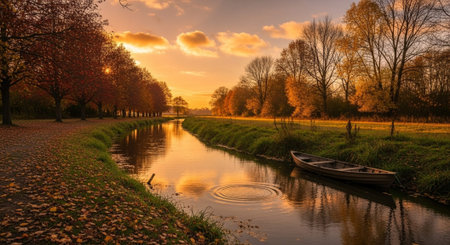 The sun sets over a tranquil landscape, illuminating vibrant autumn leaves scattered on the ground. Trees stand tall, showing their seasonal colors against the warm glow of the evening light.