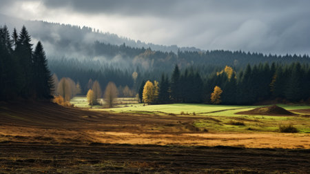agricultural land featuring a picturesque scene of deciduous trees and firs under a rainy sky. the tops of the trees are visible, adding a touch of natural beauty to the landscape. ai generated