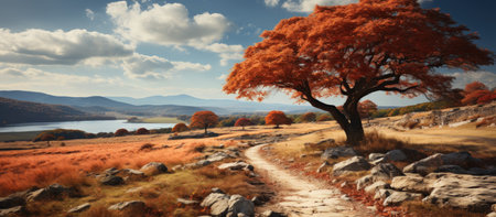 A vibrant autumn landscape featuring a solitary orange tree amidst rolling hills covered in golden and green foliage under a cloudy sky