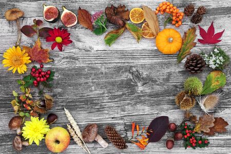 Autumn nature composition forming an abstract background border with food, flowers, leaves & natural fauna on rustic wood. Harvest festival & Halloween theme. Flat lay, top view.