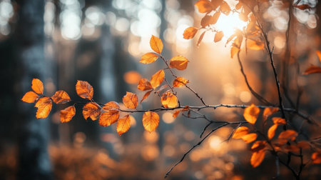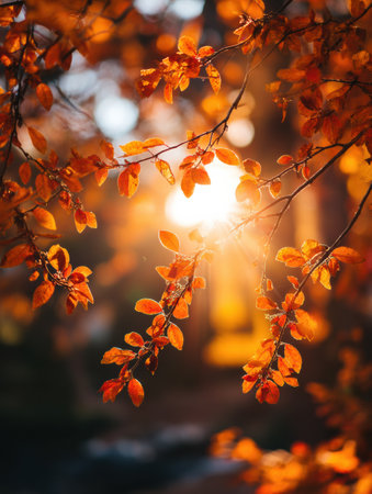 Sunlight shines through delicate branches adorned with orange leaves, capturing the essence of a peaceful autumn afternoon in nature.