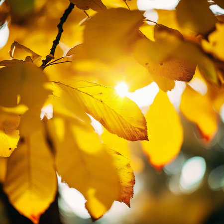 A close up of a tree with yellow leaves and sun shining through, AI