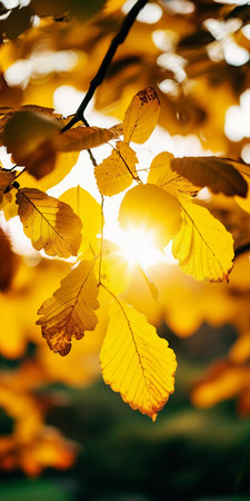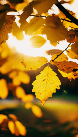 Vibrant yellow leaves glow warmly in the gentle sunlight, capturing the essence of an idyllic autumn day. The beauty of nature unfolds in a peaceful moment.