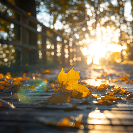 A serene scene capturing autumn leaves strewn across a peaceful pathway, illuminated by warm sunlight during sunset. The vibrant hues of nature create a tranquil atmosphere.
