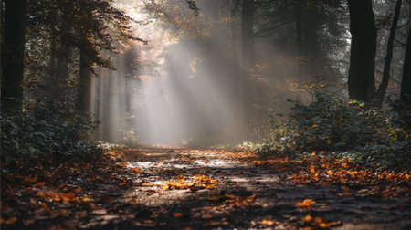A misty forest path covered in autumn leaves, sunlight breaking through the trees in gentle rays, a quiet and meditative atmosphere