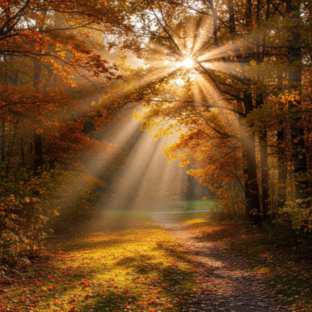 A serene autumn scene showcases a pathway illuminated by the warm glow of the sun. The sun's rays filter through the colorful foliage, casting a golden light on the fallen leaves and creating a tranquil atmosphere. The path is flanked by trees with leaves in shades of orange, yellow, and red, adding to the picturesque beauty of the forest.