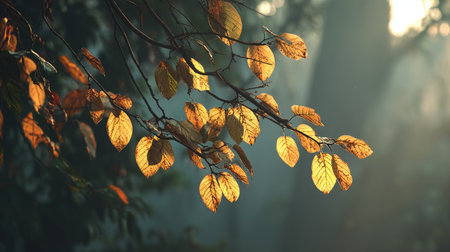 A serene close-up of dewy leaves clinging to a branch, illuminated by soft morning light, set against a misty forest backdrop during autumn. Perfect for nature lovers.