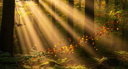 An AI generated illustration of A vibrant autumn scene featuring a lush forest with leaves floating in the air, illuminated by a warm golden light