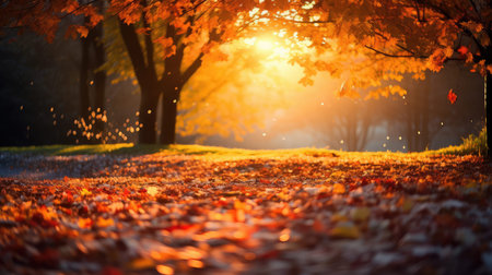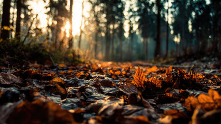 Captivating view of golden autumn leaves scattered on the ground, bathed in warm sunlight, with trees creating a serene backdrop, representing the beauty of fall.