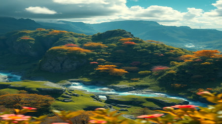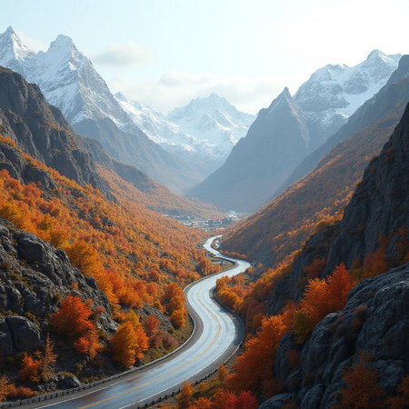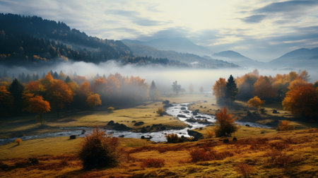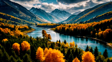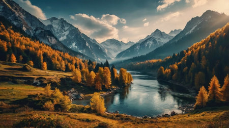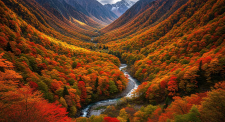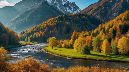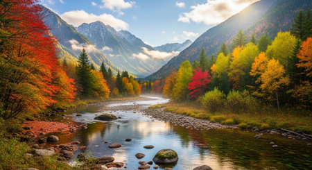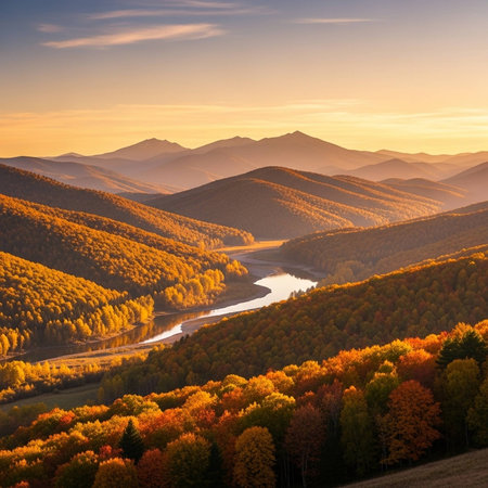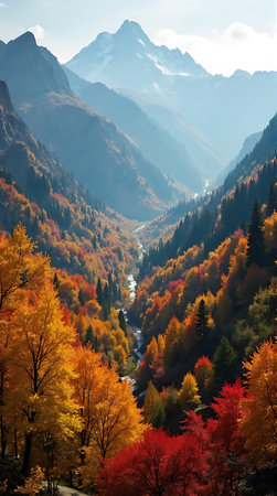 Dramatic mountain valley showcases vibrant autumn foliage and a winding river under soft natural light, creating a scenic and peaceful landscape perfect for nature travel themes.