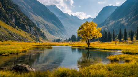 A tranquil mountain scene featuring a lone golden tree mirrored perfectly on the still water, surrounded by gentle slopes and a peaceful, contemplative atmosphere.