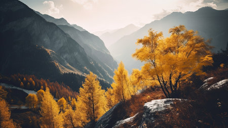 Beautiful autumn landscape with yellow larch trees in the mountains.