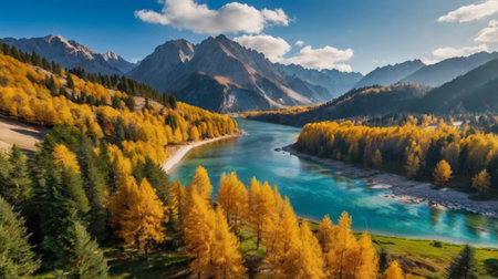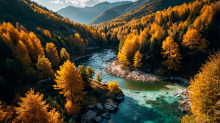 A tranquil river winds through a dense forest showcasing a display of autumn foliage in vivid shades of orange, red, and yellow, with trees...