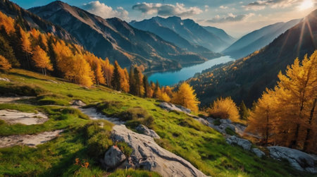 Majestic mountain landscape with vibrant autumn foliage and sky
