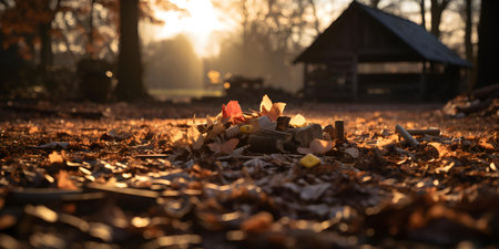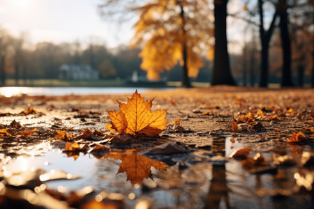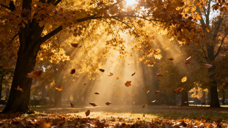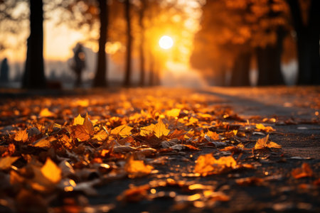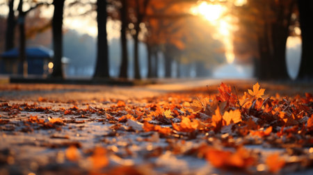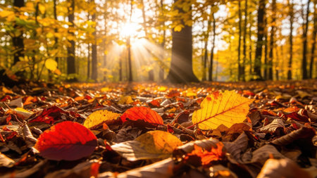 Captivating view of golden autumn leaves scattered on the ground, bathed in warm sunlight, with trees creating a serene backdrop, representing the beauty of fall.