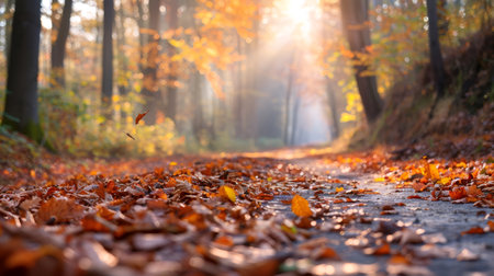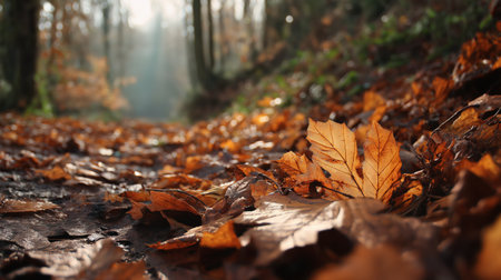A serene autumn scene showcasing fallen leaves on the ground illuminated by soft sunlight, evoking a peaceful and vibrant atmosphere in nature.