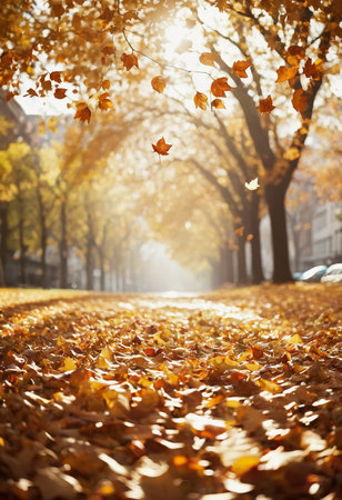 Sunlight filters through branches as leaves fall gently to the ground, carpeting the street in shades of gold and amber, creating a serene autumn atmosphere.