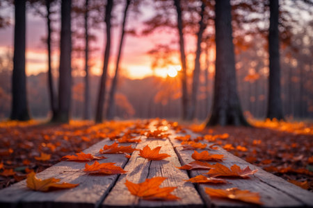 Autumn leaves covering a path in the forest during a beautiful sunset