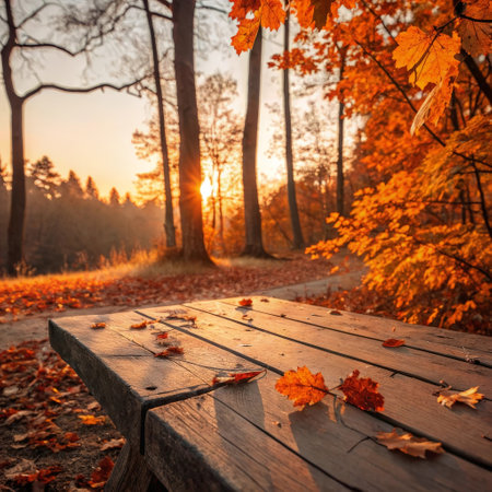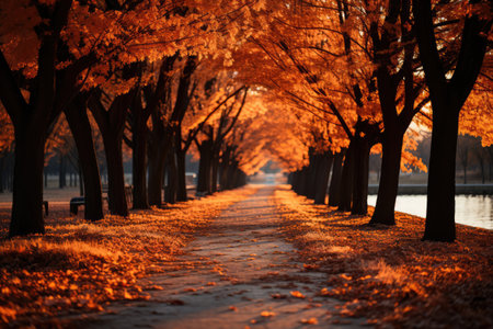 A tranquil park bench bathed in golden hour light, surrounded by a vibrant carpet of fallen leaves The picturesque fall foliage paints the scene in warm hues, creating a serene atmosphere perfect for relaxation and reflection This stunning image captures the beauty and tranquility of autumn AI Generative