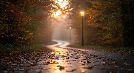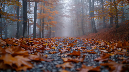 A misty forest path covered in fallen autumn leaves, capturing the essence of a tranquil fall morning
